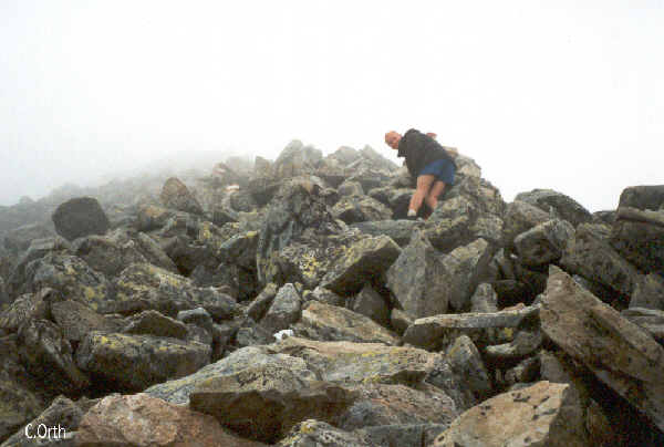 Schneefeld geht man nur noch durch grobes Geröll bis zum Gipfel. Leider war der Gipfel meistens in Wolken als wir oben