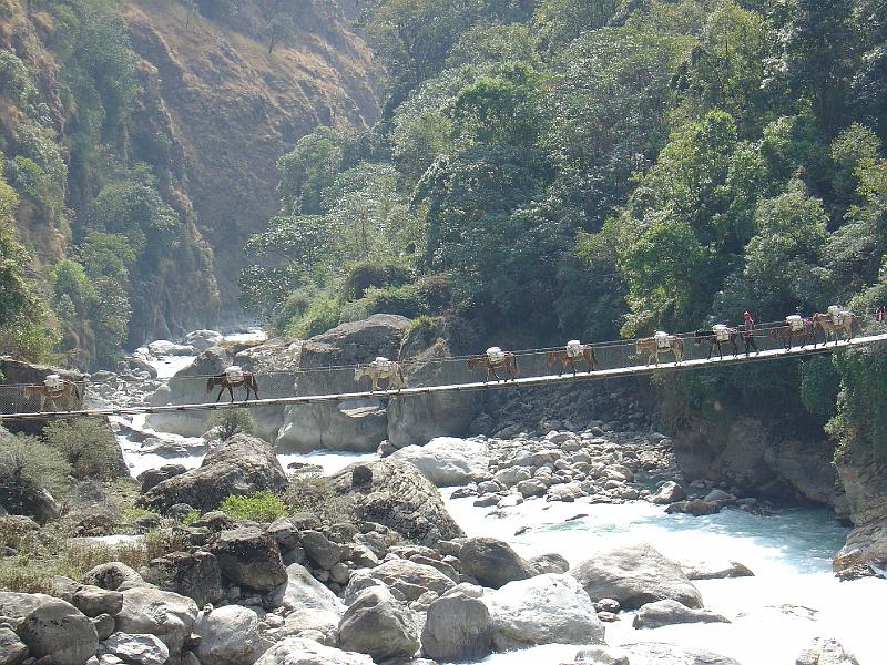 matschigen Abstieg zur Brücke erst einmal eine riesige Eselkarawane passieren