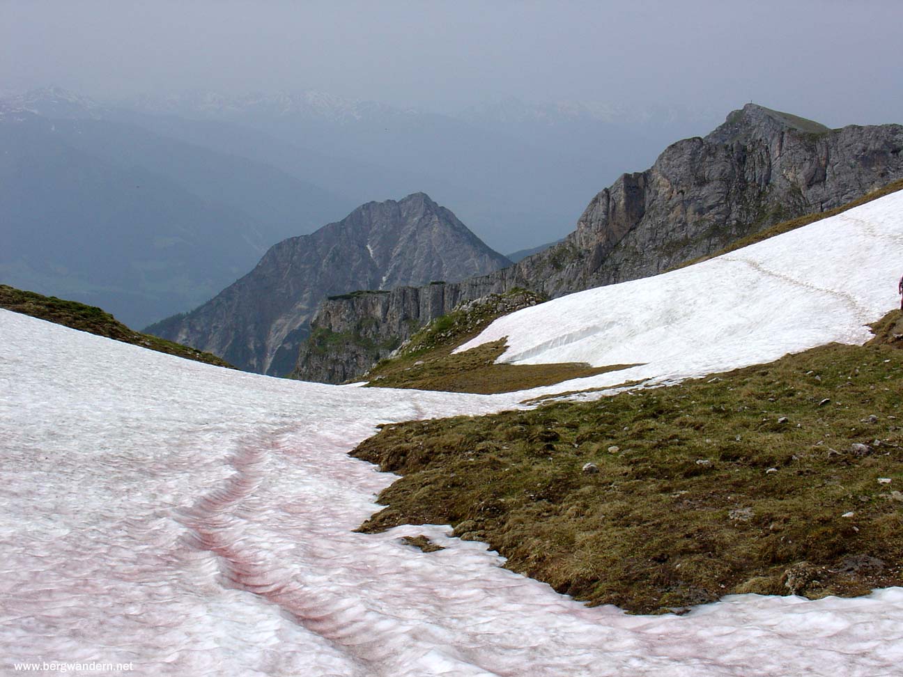 einer roten Schicht überzogen waren. Am ersten Schneefeld dachte ich noch, dass